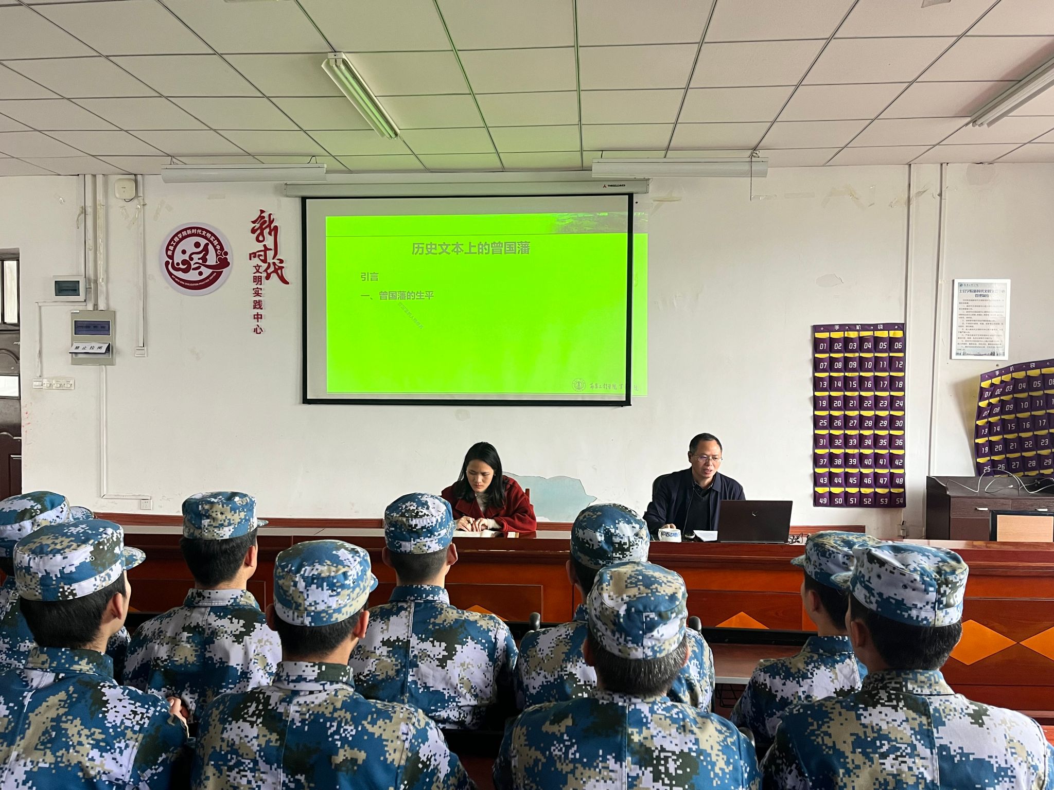 章建明围绕曾国藩的生平、人格修养与其对我国近代军事的影响等方面与学生展开亲切交流,他指出,曾国藩出生普通,却能成就一番大事业,离不开他的自警与努力,他勉励军士生要向曾国藩学习,踏实学习,努力训练,为进入部队历练筑牢扎实基础。