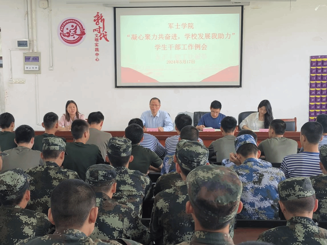 为进一步提高军士生爱校荣校意识,营造奋发向上的校园氛围。5月17日,军士学院在新时代文明实践中心组织开展“凝心聚力共奋进,学校发展我助力”学生干部工作例会。学院党委书记章建明,辅导员封昕雨、廖章一、敖诗意以及全体学生干部共计100余人参加。