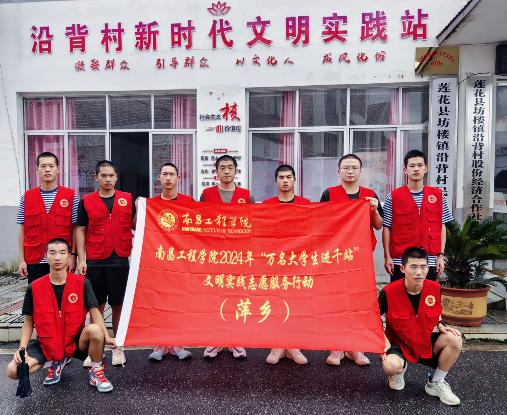 图为实践团成员在沿背村新时代文明实践站合影