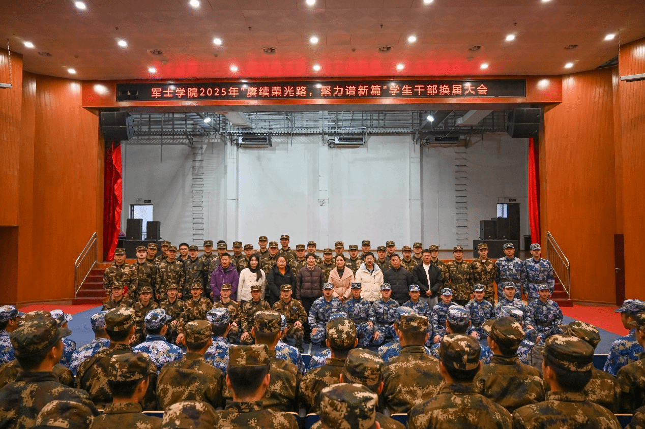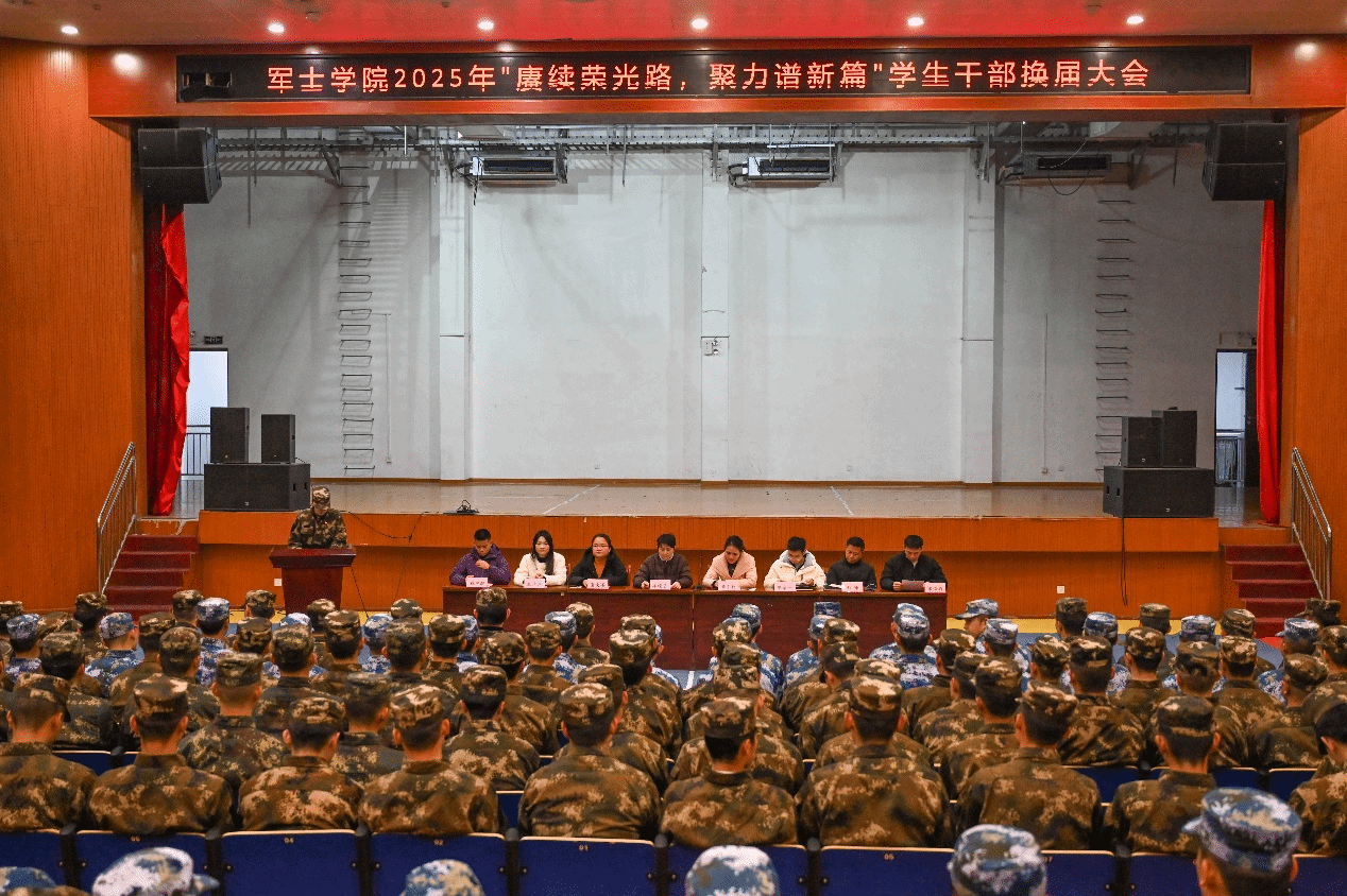 为进一步凝聚学生干部队伍合力。12月29日,军士学院在礼堂开展2025年“赓续荣光路,聚力谱新篇”学生干部换届大会。大会由学生干部魏思健主持,学院党委副书记涂晓雯、辅导员及全体学生干部共计两百余名师生参加。