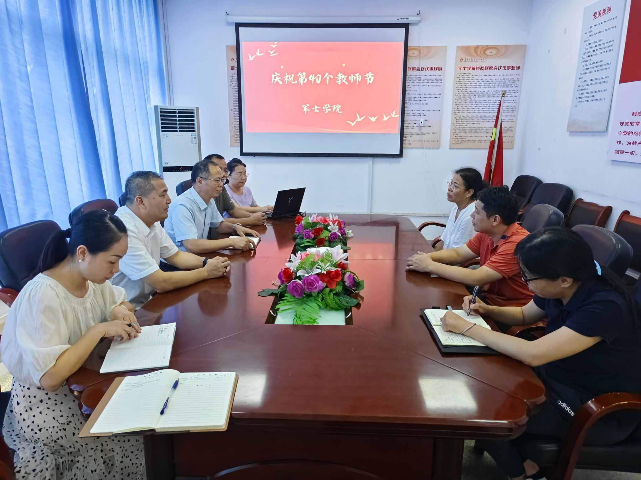 为庆祝第40个教师节,9月9日,军士学院在彭桥校区图书馆201会议室召开教师座谈会,学院领导班子成员及教师代表参加此次会议。