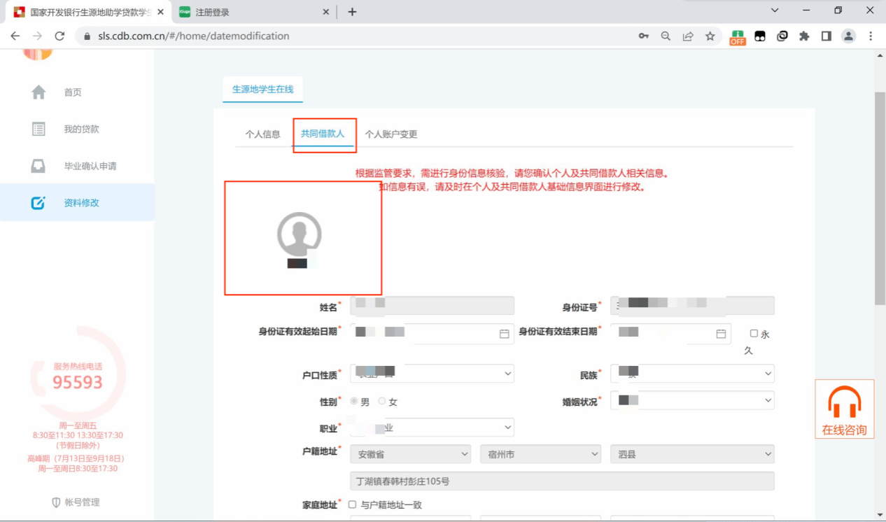 核实“个人信息”和“共同借款人信息”,检查是否有错误或需要更改信息,如若更新完毕点击提交即可。(共同借款人信息点击第二张图片的红框标识处头像即可展开)